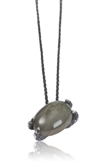 Oxidised Sterling Silver pendent with an 18mm x 13mm cabochon Labradorite. Approximate size 18mm x 10mm x 10mm (high) claw on a 20inch chain.