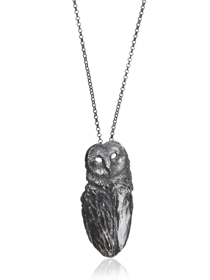 Oxidised Sterling Silver pendent. Approximate size 20mm x 40mm owl figure.